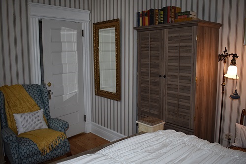 The DeEtta Room is the smallest of the rooms but one of the mosty quaint. The Saveaha Queen Poster Bed pops with metallic sheen and the intricate moulding feels Old World. The original bathroom and clawfoot tub combined with antique subway tile showcase the Old World bath.