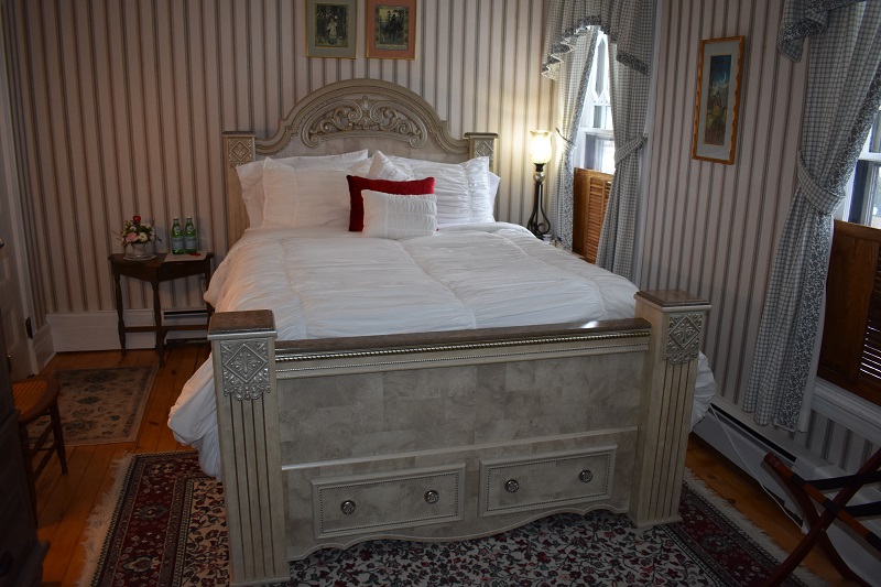 Has one of the best views of both the lake and the village. A 19th century Renaissance Revival Ledelle queen size sleigh bed with a remote control tempur-pedic mattress and matching furnishings adorn the room. The large attached bath with its ornate window looking out at the lake, has a stall shower and plenty of room for your toiletries.